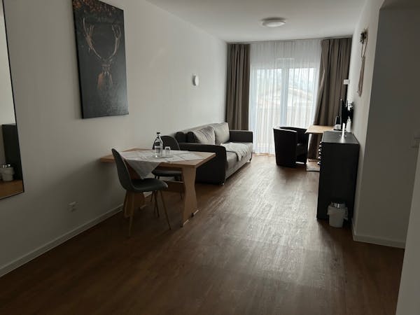 Die Juniorsuite Hochplatte, liegt auf der Nord-Ost Seite unseres Hotels, fernab der Straße. Es verfügt über einen getrennten Schlaf- und Wohnbereich und einen großen Balkon mit Blick auf die allgäuer Landschaft, Sowohl Schlafbereich, als auch Wohnbereich verfügen über einen Flachbild-TV. Tee- und Kaffeezubehör und auch frisches Wasser stehen zur Verfügung. Die Zimmer sind auch mit einem Kühlschrank und ein Safe ausgestattet.