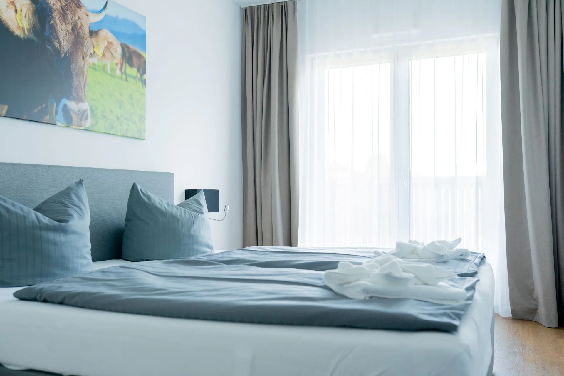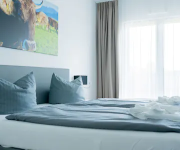 The Hochplatte junior suite is located on the north-east side of our hotel, far away from the street. It has a separate sleeping and living area and a large balcony with a view of the Allgäu landscape. Both the sleeping area and living area have a flat-screen TV. Tea and coffee making facilities and fresh water are available. The rooms are also equipped with a refrigerator and a safe.